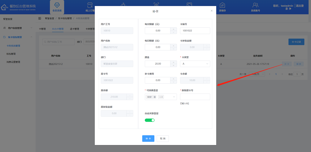 ②設(shè)置用戶的每日限額、卡編號(hào)、每日限額、押金、補(bǔ)卡費(fèi)用、新物理卡號(hào);選擇卡類型、可消費(fèi)食堂;設(shè)置是否自動(dòng)關(guān)聯(lián)食堂;