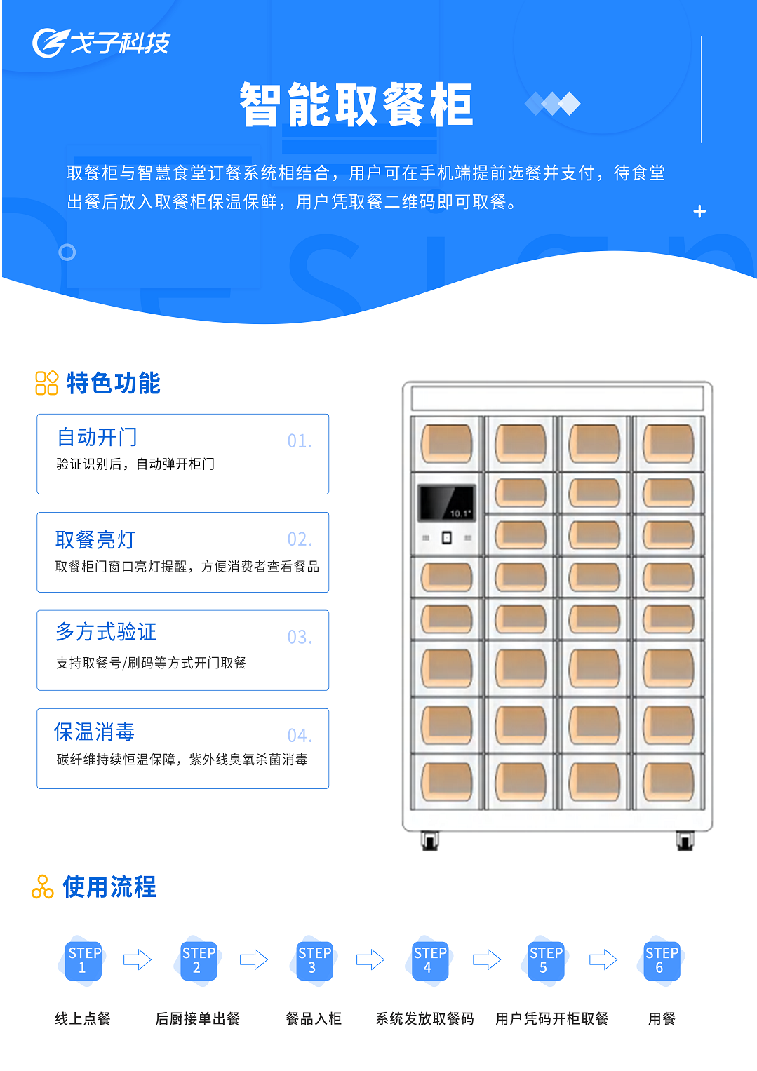戈子科技智能取餐柜有保溫、加熱、制冷、消毒等多種功能,可以分散放置在食堂、員工辦公區(qū)內(nèi),緩解員工排隊(duì)擁擠,工作忙沒有時(shí)間去食堂取餐問題。訂餐人員根據(jù)收到的取餐二維碼在餐柜掃碼自提,簡單方便,隨時(shí)都可吃到的飯菜。