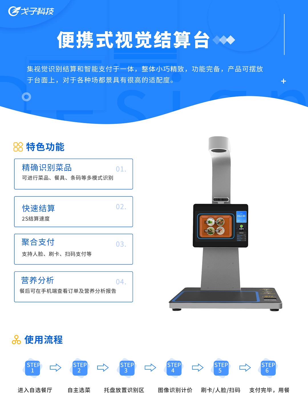 視覺結(jié)算臺(升級款),是戈子科技新研發(fā)的一款依托圖像識別技術(shù)用于團膳領(lǐng)域?qū)崿F(xiàn)智能結(jié)算的創(chuàng)新型設(shè)備,能夠根據(jù)菜品的特性快速智能識別 “結(jié)算區(qū)”中的餐具、產(chǎn)品圖像并智能精準(zhǔn)結(jié)算,并連接一卡通等第三方支付系統(tǒng),讓就餐者快速完成支付,減少排隊時間。