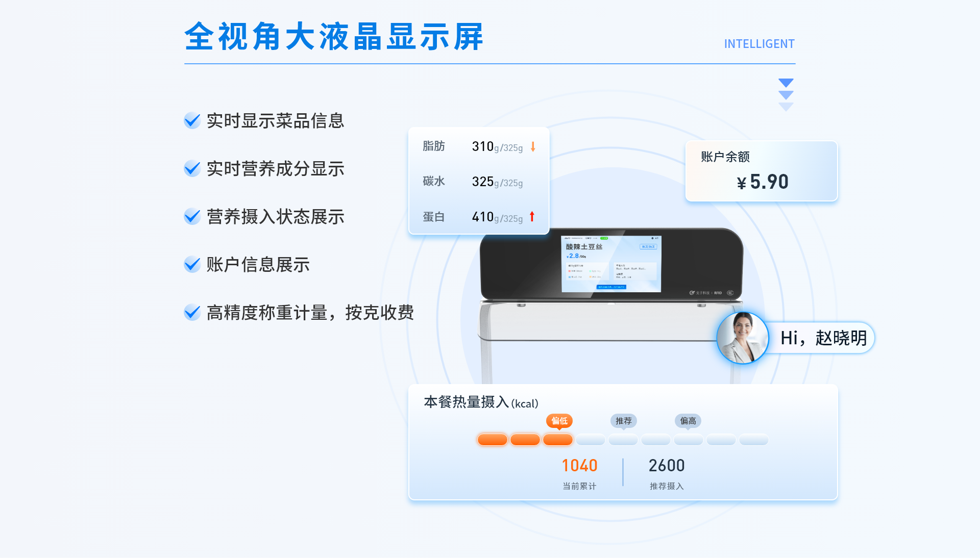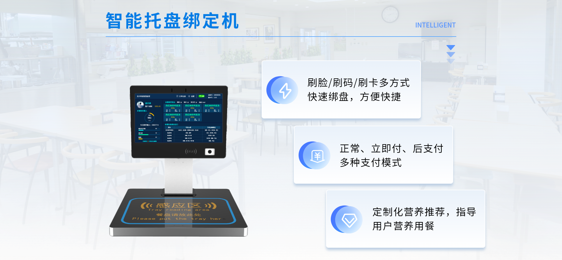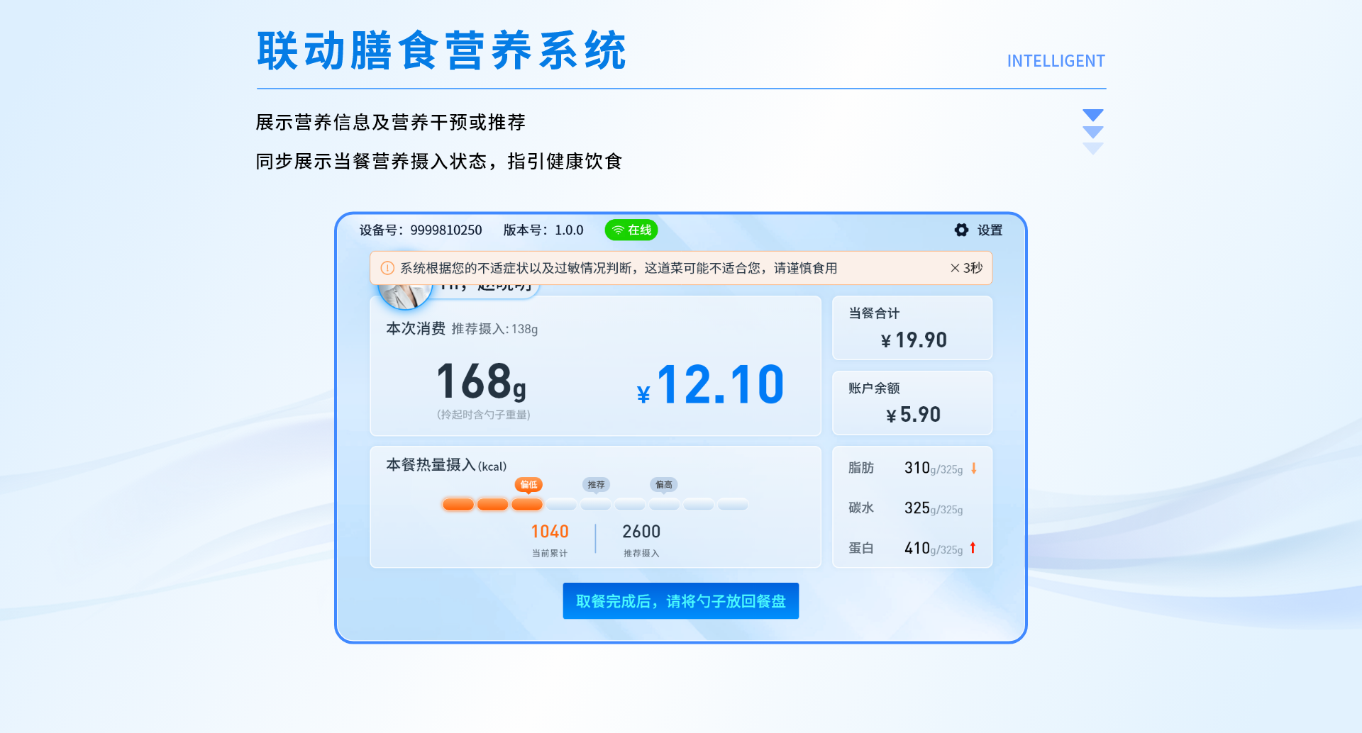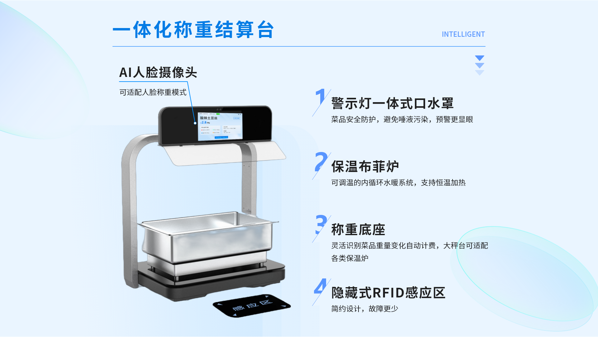 智能稱重結(jié)算臺(tái)一體化設(shè)計(jì),基于餐飲云平臺(tái)為就餐者提供的無(wú)感支付、自助餐飲的智能化集成式系統(tǒng)。用戶綁定托盤后,通過(guò)托盤感應(yīng)臺(tái)讀取托盤信息,即可在多個(gè)智能秤上自助稱重取餐,取餐完成后通過(guò)空中支付進(jìn)行就餐結(jié)算。