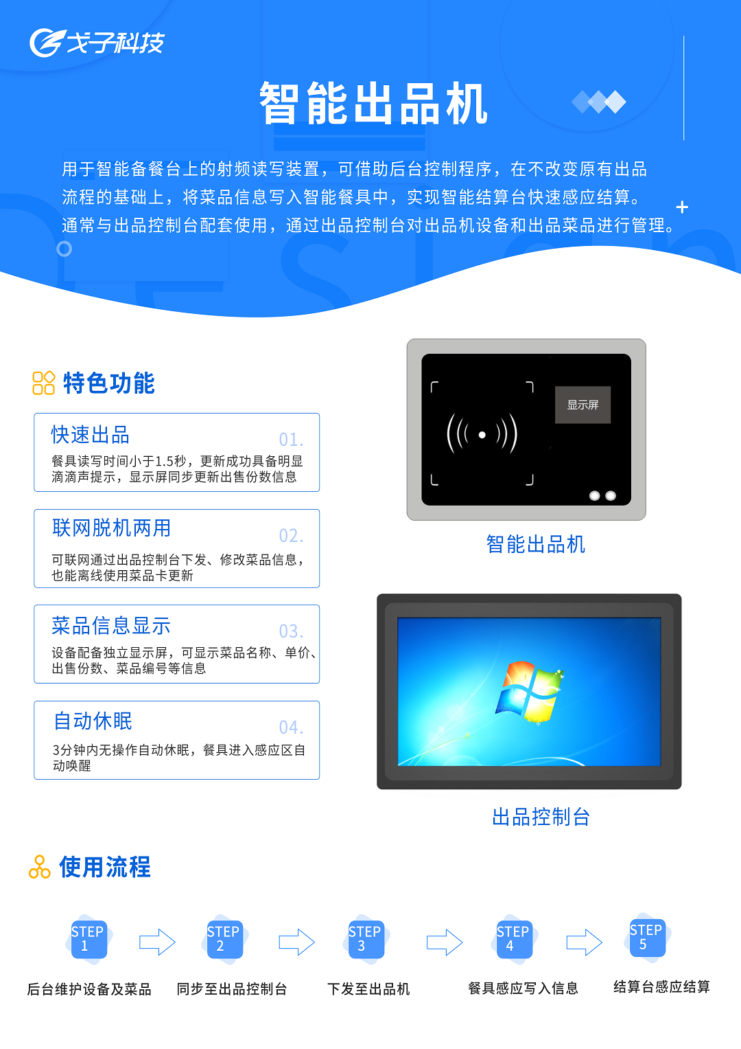 戈子科技智能出品機(jī)(嵌入式)是嵌入在智能備餐臺上的射頻讀寫裝置,可借助后臺控制程序,在不改變原有出品流程的基礎(chǔ)上,將菜品信息寫入智能餐具中,以實(shí)現(xiàn)智能結(jié)算臺通過芯片感應(yīng)寫入的菜品信息進(jìn)行快速結(jié)算。通過智能出品管控系統(tǒng),可以統(tǒng)一餐盤顏色,減少餐盤分類分揀,減少后廚人員清洗工作量。