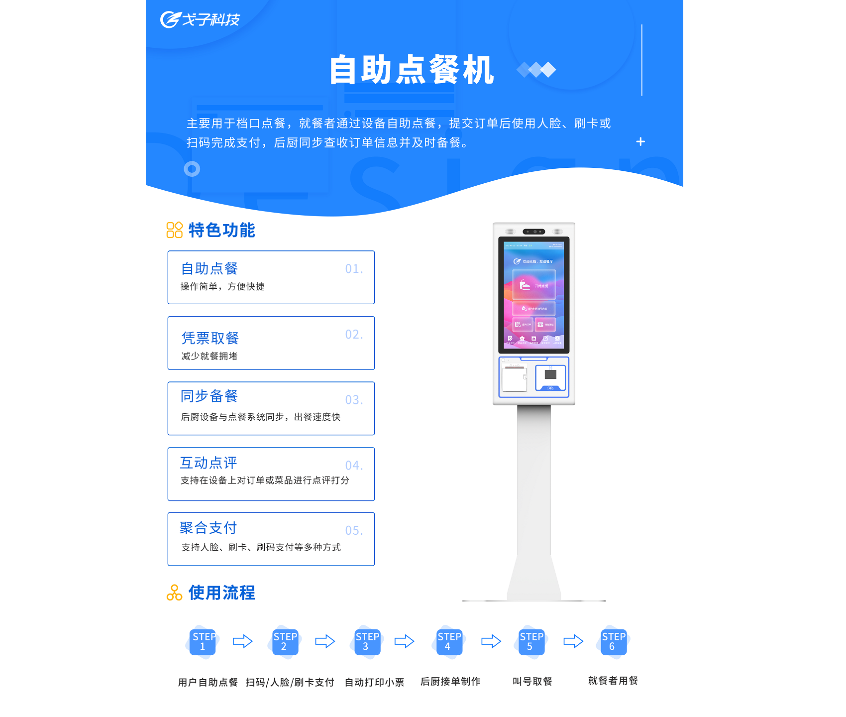 戈子科技自助點(diǎn)餐機(jī)有效利用自助點(diǎn)餐系統(tǒng)搭合理搭配叫號(hào)取餐系統(tǒng),人臉收銀等設(shè)備硬件,無縫整合智慧餐廳的前端硬件和軟件,后廚系統(tǒng),實(shí)現(xiàn)對(duì)餐廳的集成化智能管理。