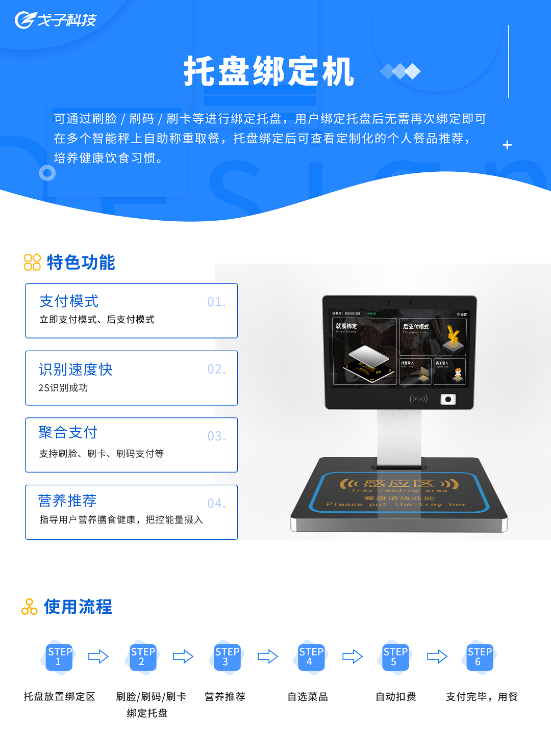 戈子科技智慧食堂托盤綁定機(jī)-餐廳內(nèi)部一卡通用戶可在人臉托盤綁定機(jī)上注冊(cè)人臉綁定托盤,人臉已注冊(cè)的用戶可直接在托盤綁定機(jī)上通過(guò)人臉進(jìn)行綁定托盤,用戶也可在托盤綁定機(jī)上直接刷卡綁定托盤,用戶綁定托盤后無(wú)需再次綁定即可在多個(gè)智能秤上自助稱重取餐,取餐完成后通過(guò)空中支付進(jìn)行就餐結(jié)算,以實(shí)現(xiàn)在餐廳稱重取餐并無(wú)感支付的飲食體驗(yàn)。