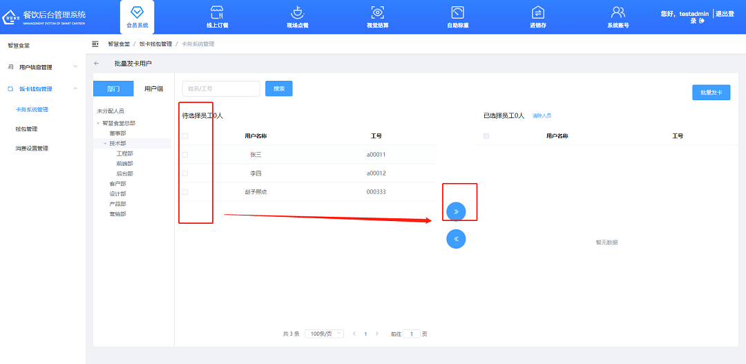 ②在部門、用戶主或者自行添加的組類選擇需要添加的人員(或者通過搜索框搜索需要添加的人員),勾選用戶名稱的前面的選項(xiàng),點(diǎn)擊“箭頭”按鈕,移動(dòng)到右邊(若不需要,可點(diǎn)擊“清楚人員”按鈕移除選項(xiàng)),再點(diǎn)擊“批量發(fā)卡”進(jìn)入下一個(gè)“計(jì)出配置”彈窗;