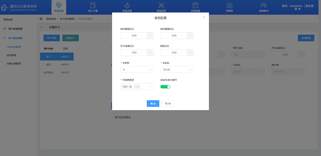 ②設(shè)置用戶的每日限額、卡編號(hào)、每日限額、押金、補(bǔ)卡費(fèi)用、新物理卡號(hào);選擇卡類型、可消費(fèi)食堂;設(shè)置是否自動(dòng)關(guān)聯(lián)食堂;