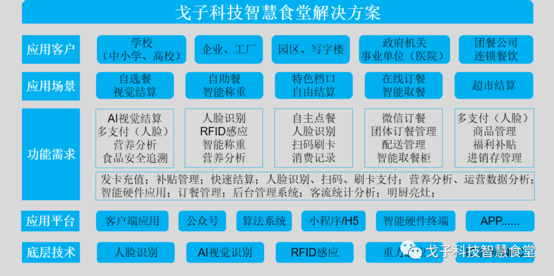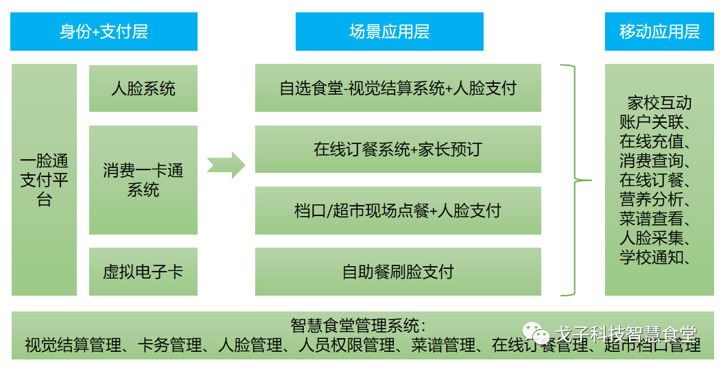 戈子科技結(jié)合高校、中小學(xué)等食堂實(shí)際運(yùn)營(yíng)場(chǎng)景以及學(xué)校、家長(zhǎng)、師生各方的實(shí)際需求,在整體智慧食堂解決方案背景下,打造了專注于學(xué)校智慧食堂場(chǎng)景的解決方案。